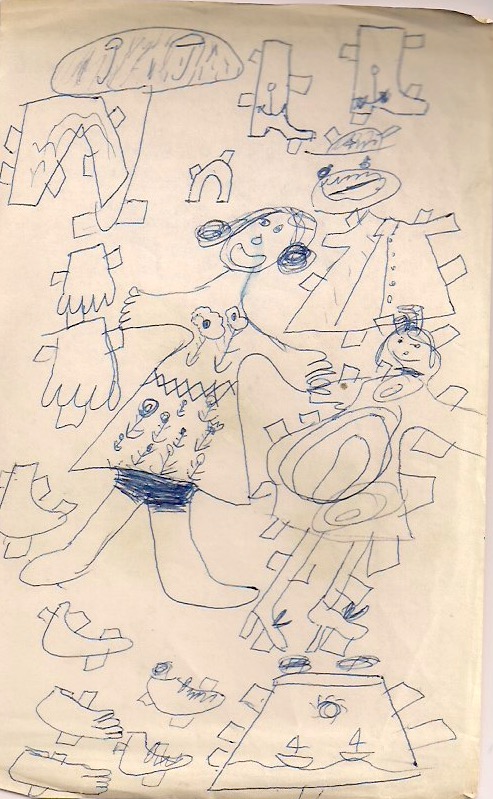 The children, and Inky, our Cocker Spaniel, were loving the freedom of the desert. We bought a wagon for Lesley. She pulled Sandy around the front yard, and over to the goat pen to watch the goats. On quiet afternoons, when Sandy was napping, Lesley liked to draw. Here is a sample of the paper dolls she created, even adding bare feet to put on to go to bed.